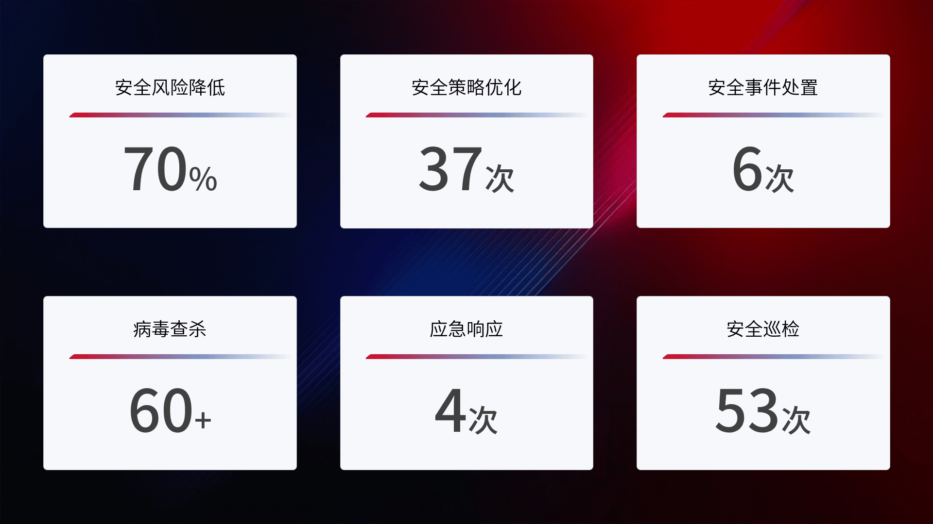 提供全面的安全事件报告体系,,包括处置报告、、、周报、、、、季度和年度总结,,,结合持续监控,,,,帮助客户深入了解网络安全状况。。
